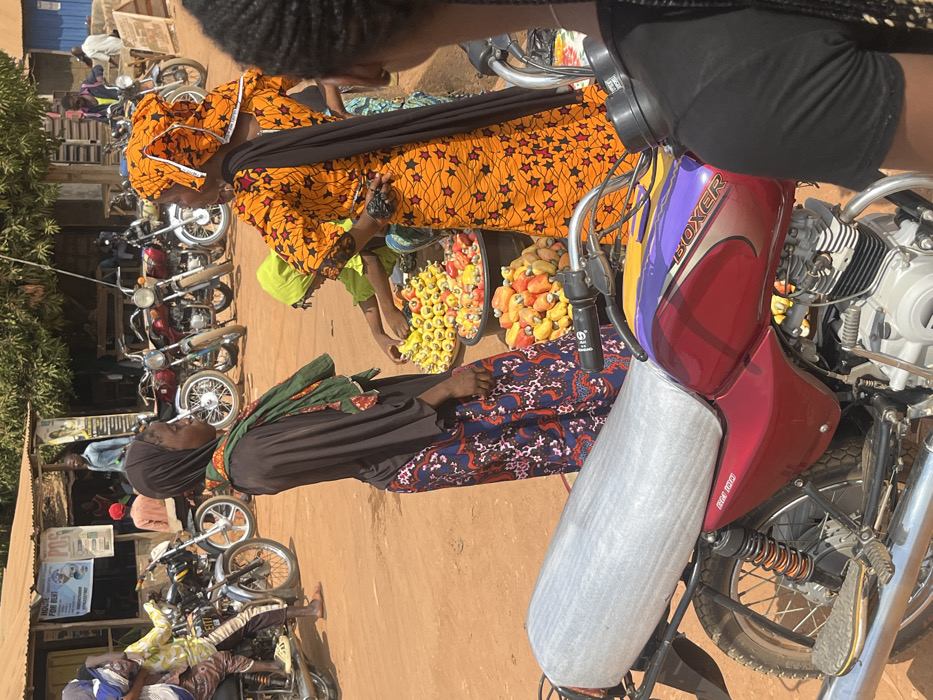 This image depicts a bustling outdoor market scene in Lafia, Nigeria. In the immediate foreground, the left side of a red and purple Bajaj Boxer motorcycle, with a grey foam-covered seat, is visible. In the mid-ground, three females are observed. To the left, a female wearing a dark brown top, a green patterned headscarf, and a blue, red, and white patterned skirt stands, looking towards the right. Her hands are at her sides. To her right, a second female wears a vibrant orange dress with black star patterns, an orange and white patterned head covering, and a black shawl. She stands with her right hand on her hip, looking towards the left, potentially interacting with the first female. Below and slightly behind the second female, a third individual, partially obscured and wearing a light green head covering, is bending over large black bins filled with bright yellow and red/orange cashew apples. These bins are arranged on the reddish-brown dusty ground. In the background, numerous motorcycles are parked, indicating a common mode of transport. Several men are visible; one man in a light-colored top and patterned shorts is seated on a motorcycle to the left. Other men are standing or sitting near simple, open-fronted market stalls with corrugated metal roofs. One stall features a sign advertising "HOUSE FOR RENT" and "POS." The environment is characterized by bright natural sunlight, dusty ground, and sparse background vegetation.