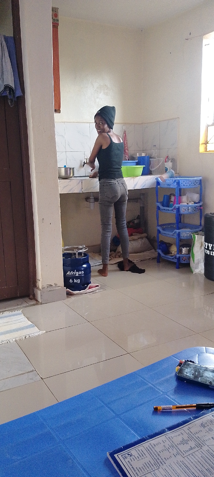A woman in a beanie, tank top, and jeans is washing dishes in a kitchen. A blue gas cylinder sits next to her. A blue plastic shelving unit holds various kitchen items. The kitchen features tiled walls and flooring. A blue table with papers and a phone are in the foreground. The woman is smiling and looking at the camera.