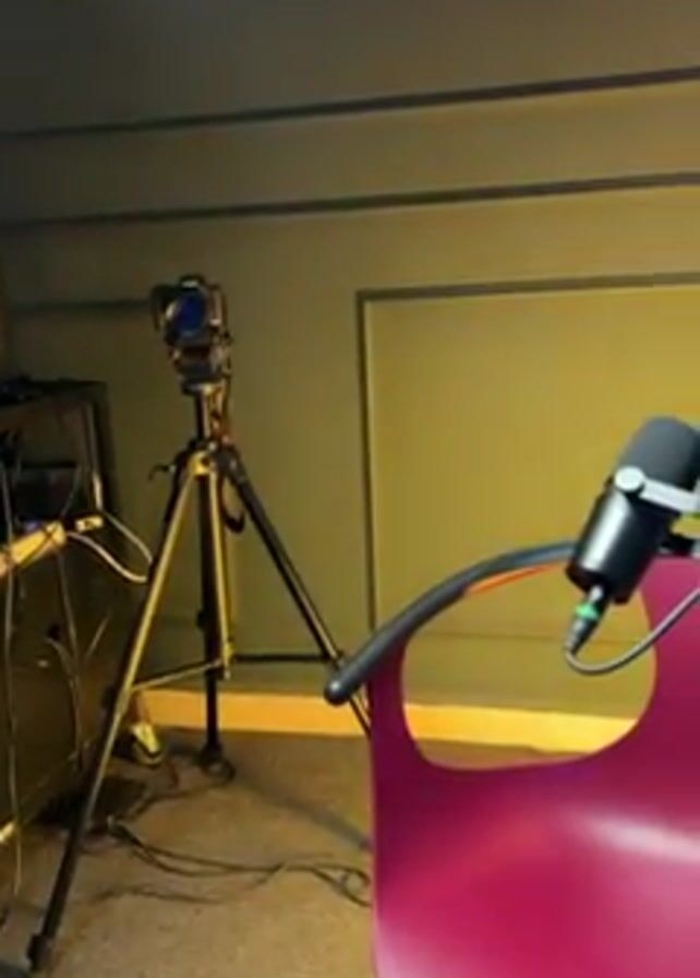 A camera is positioned on a tripod in a room that is in the process of changing color from yellow to green. There is a rack of audio-visual equipment to the left of the camera. A microphone is attached to a stand next to a bright red chair. A small table with a lamp on top can be seen.