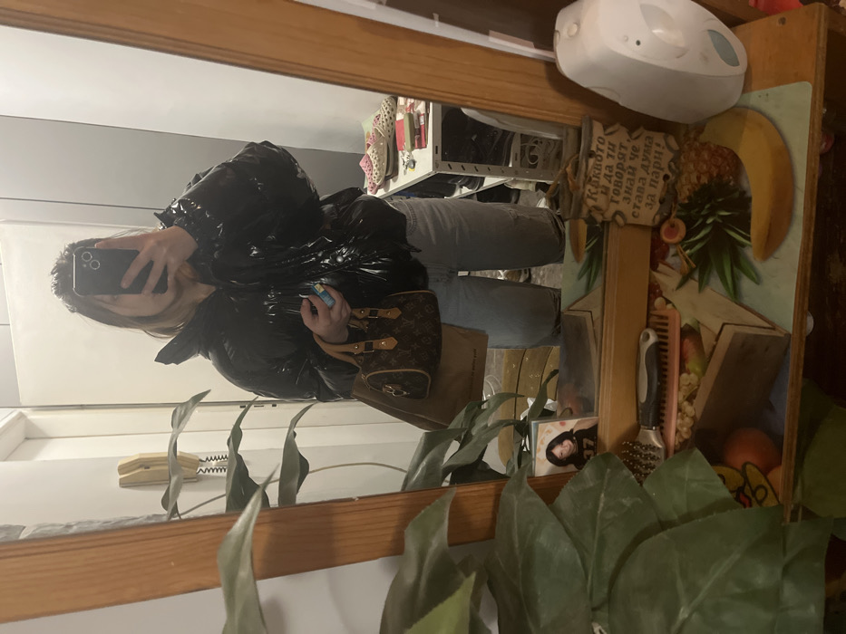 A female individual captures a mirror selfie indoors within a private residence in Sofia, Bulgaria. The subject wears a shiny black puffer jacket and light-wash, distressed denim jeans. Her face is obscured by a black smartphone with a visible dual-lens camera system, held in her right hand to take the photograph. In her left hand, she holds a small blue and white object, likely a lighter, and a small Louis Vuitton monogrammed handbag, beneath which a larger plain brown canvas bag or dust bag hangs. The reflection reveals a domestic setting. To the left, a large green houseplant partially obstructs a wooden-framed mirror. Behind the plant, a light-colored wall features a white intercom unit with a coiled cord. Below the mirror, on a shelf or dresser, a small framed photograph of a young girl is visible, alongside a black and grey hairbrush and a light-colored comb. To the right, a white shelving unit with various shoes, including patterned Crocs-style clogs, is reflected. Adjacent to these items, a decorative wooden plaque with Bulgarian text is prominently displayed, reading: "Каквото и да ти говорят, знай че става дума за пари!" (Translation: "Whatever they tell you, know that it's about money!"). The surface beneath the mirror is partially covered by a colorful placemat featuring fruit designs (pineapples, bananas, and oranges). A white, egg-shaped electronic device rests on the far right of this surface. The environment is lit by interior artificial lighting.