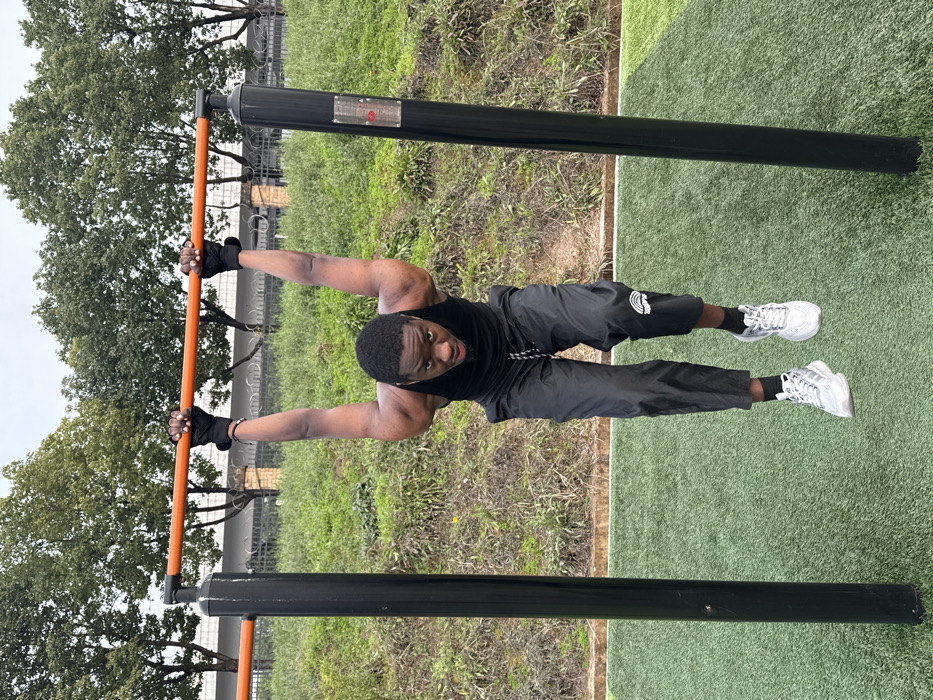 An adult male is performing a dead hang on an outdoor pull-up bar in Jiangjin, China. The individual, appearing to be of Black ethnicity, is centered in the frame, gripping an orange horizontal bar with both hands in an overhand grip, arms fully extended. He wears a black sleeveless tank top, black fingerless athletic gloves, black athletic trousers with a white drawstring and a rainbow logo on the left leg, white socks, and white and light grey athletic shoes. His feet are suspended above green artificial turf. His facial expression is intense, directed towards the camera. The pull-up bar is supported by two black vertical poles; the right pole features a silver rectangular plaque with a red element. In the background, a grassy incline with natural vegetation leads to a light-colored wall topped with a dark, pointed metal fence. Mature trees with green foliage are visible behind the fence under an overcast sky.