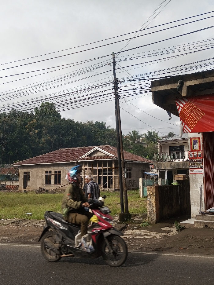 A person on a red and black motorcycle drives on a paved road in front of a grassy field. Behind them stands a single-story house under construction with a red tile roof, as well as a two-story house. Power lines stretch across the sky above a wooden telephone pole, with trees in the background. A red and white banner hangs from a building to the right.