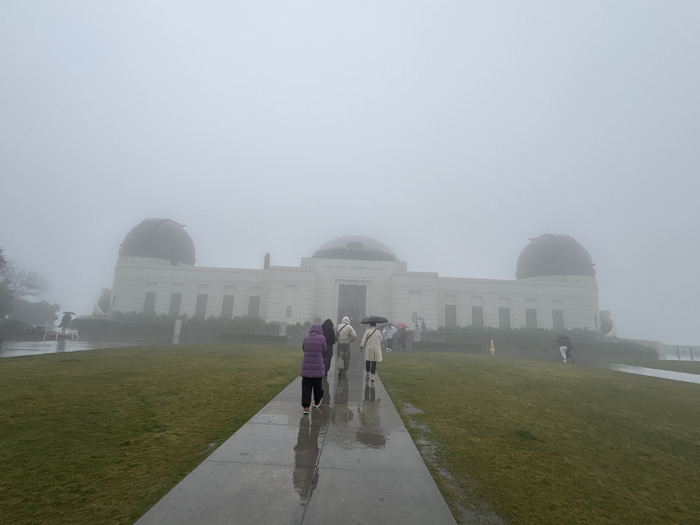 The photo depicts the Griffith Observatory in heavy fog. People walk towards the building along a wet stone path. The observatory's distinct domes are visible, though obscured by the dense fog. The surrounding lawn is green, and the overall atmosphere is overcast and damp. Some individuals hold umbrellas against the rain. The scene highlights the observatory's architecture despite the poor weather conditions.