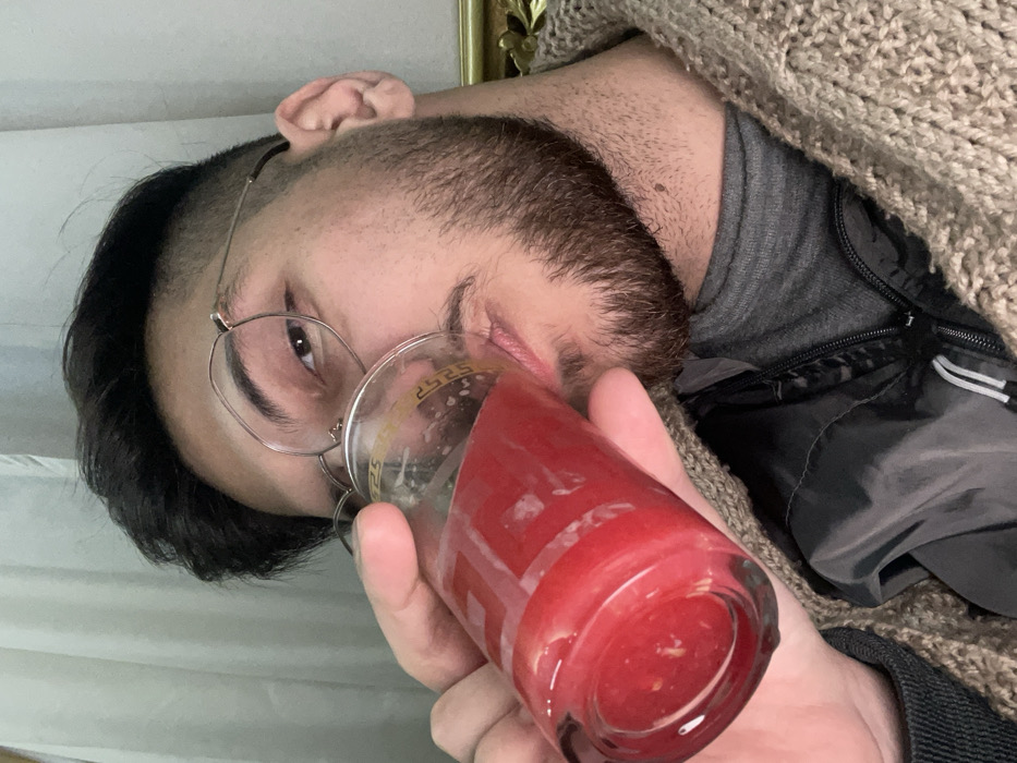 A male individual, appearing to be in his 20s or early 30s, is depicted in a medium-to-close shot, holding a clear glass filled with a red liquid to his mouth