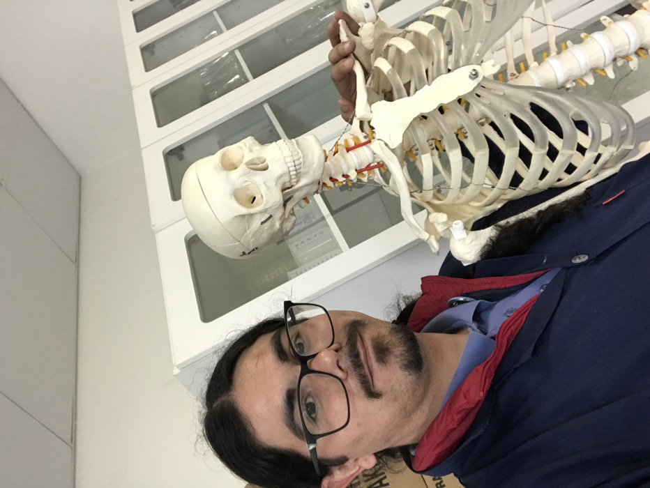 An indoor photograph depicts a male individual and a human anatomical skeleton model within a room in Midrand, South Africa, likely a laboratory or classroom setting. The male, positioned on the left, has dark hair, a mustache, a goatee, and wears dark-rimmed glasses, a blue collared shirt, and a dark blue jacket with a red inner lining. He is oriented towards the camera, with his right hand resting on the left shoulder of the skeleton model. The full-size skeleton model, positioned to the right, displays a light-colored skull, rib cage, and a portion of the vertebral column with red and yellow accents. The background features white cabinets with glass doors, containing various pieces of laboratory glassware, against a white wall and ceiling.