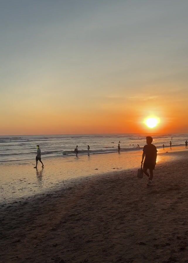A wide shot shows a beach at sunset. The sky transitions from light blue to orange, with the sun just above the horizon. Several people are visible, scattered along the beach and in the water. Some individuals are walking along the wet sand, their silhouettes highlighted by the sunset. One person in particular walks towards the camera on the beach's edge, carrying a bag. The sea reflects the sunlight. The sand is dark and wet, indicating recent high tide.
