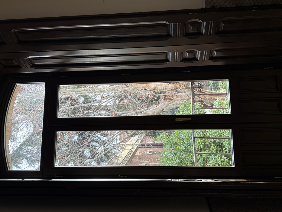 A dark window frame surrounds three panes. The left pane is curved, while the two right panes are rectangular. Through the glass, bare branches are visible against a pale sky and a building. Green foliage and a metal structure are also visible. The window is framed by a dark, ornate wooden structure, possibly a part of a larger architectural element. The light is dim, casting shadows.