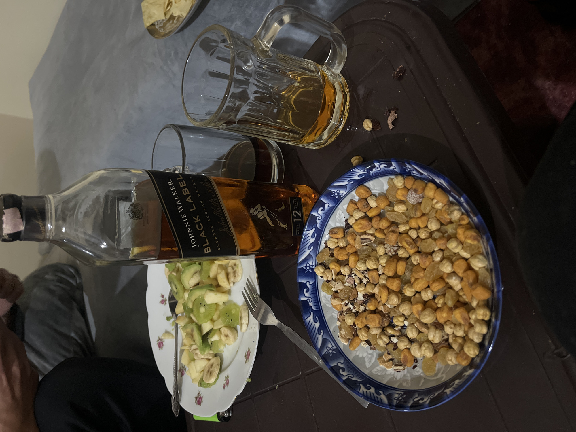 The scene depicts an indoor setting, possibly a residence in Ouaouizert, Morocco, given the request's context. On a dark-colored surface are several items: a bottle of Johnnie Walker Black Label whiskey, a partially filled glass mug and tumbler, a plate containing a mix of dried nuts and raisins, and another plate with sliced kiwi and banana. A fork rests on the plate with the fruit slices. The lighting is dim, and the scene is casually arranged, suggesting a relaxed social gathering or personal consumption. The presence of the whiskey bottle, along with snacks, points towards a possible drinking session.