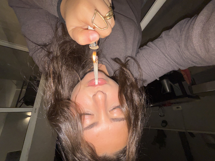 An upside-down selfie captures a person holding a lit joint to their lips with a lighter