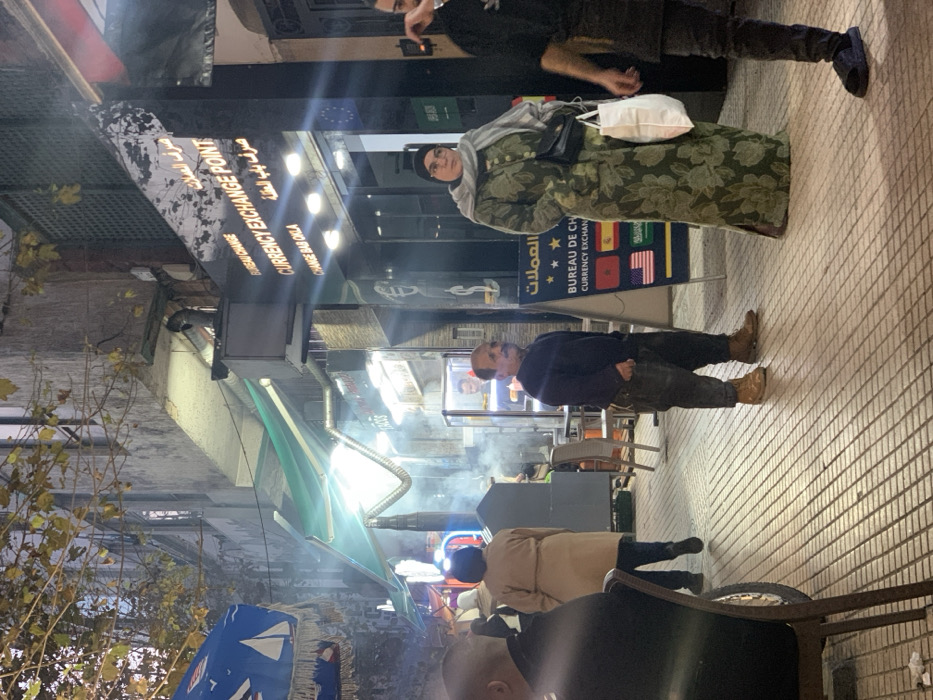 A street scene at night shows pedestrians walking along a tile sidewalk beside businesses. Signage includes a currency exchange point with text in Arabic and English, displaying flags of various countries. People are dressed in casual clothing, and some are standing near an outdoor cooking or smoking setup where smoke is visible. The scene has a mix of storefront lighting and ambient darkness.