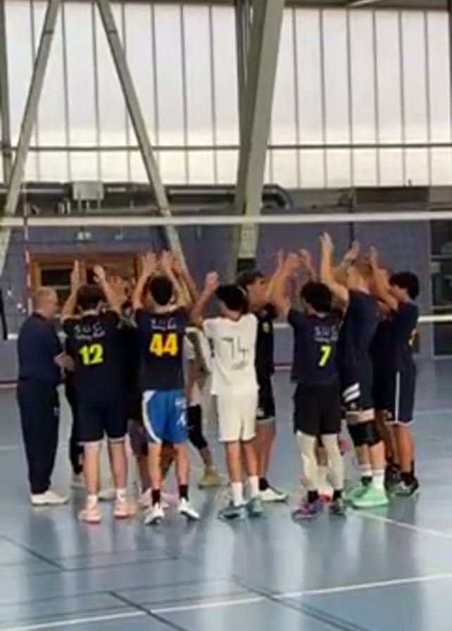 A group of male volleyball players and a coach stand in a circle on a blue volleyball court in an indoor gymnasium. The players, wearing mixed uniforms, have their hands raised in the center of the circle, clapping in unison. The coach, in a navy blue jacket, stands to the side. The gymnasium has a light blue and white ceiling with triangular metal supports, and a large window is visible in the background. A volleyball net is set up on the court.