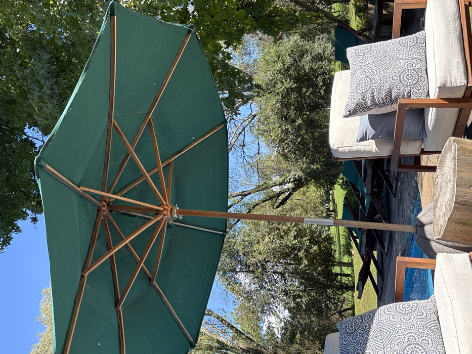 The image depicts an outdoor leisure area in Huasca de Ocampo, Mexico, under bright daylight. A large, open, hexagonal or octagonal market umbrella with a dark green fabric canopy and a visible wooden support structure (ribs and pole) occupies the upper and central portion of the frame. The umbrella's wooden pole extends down to a grey, concrete base, partially obscured by a cut tree stump serving as a rustic side table in the immediate foreground. Two empty armchairs are visible in the foreground. The left armchair, mostly out of frame, is light-colored with visible wooden arms and features a grey cushion with a white circular patterned design. The right armchair, also light-colored with wooden arms, holds a solid grey cushion and a grey cushion with a similar white circular patterned design. Behind the foreground elements and the umbrella pole, a swimming pool is partially visible with its blue water. Several dark green fabric lounge chairs with wooden frames are arranged around the pool's edge. The background consists of a dense, lush green landscape dominated by numerous trees and bushes under a clear blue sky, suggesting a resort, garden, or park-like setting. No individuals are present in the scene.