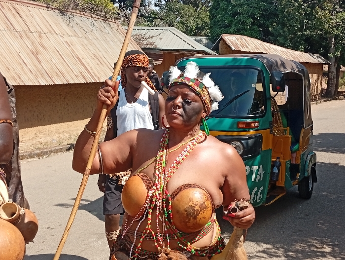 This outdoor image depicts an individual dressed in traditional attire, with accompanying figures and background elements, consistent with a cultural event in Nigeria