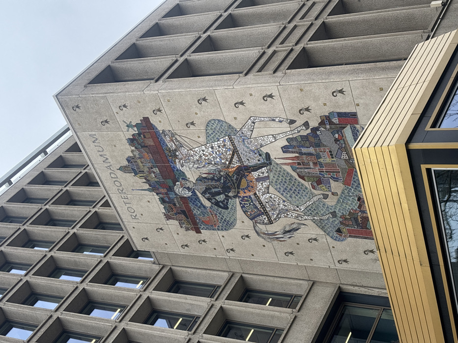 A large mosaic mural is affixed to the textured, light grey facade of a multi-story building in Rotterdam, Netherlands, under an overcast sky