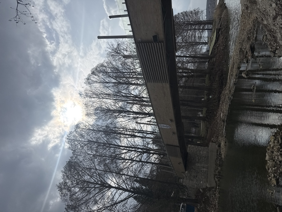 The image displays a modern pedestrian bridge crossing a narrow body of water, likely a river or canal, within a park-like setting in Nikolovo, Bulgaria. The sky is partially overcast, with a bright sunburst visible through a break in the clouds in the upper center. The bridge features a light-colored, possibly wooden or composite, deck and side panels. Horizontal slatted sections are present along the bridge's main span. A distinctive shield-shaped emblem with a white background and a blue design is affixed to the left side of the bridge structure. Numerous slender, dark-colored vertical posts, some topped with what appear to be transparent glass railings, line the top of the bridge. The bridge is supported on the left bank by a robust stone abutment. The water below the bridge is dark and reflective, showing minor surface ripples, and appears to flow from left to right. The banks are characterized by exposed tree roots, dark soil, and scattered rocks, indicating a potentially low water level. A dense line of tall, bare-branched deciduous trees, possibly poplars or cypresses, forms a backdrop along both sides of the water channel, their stark silhouettes reflected in the water. On the far left bank, partially obscured by trees, a blue structure with white lettering, possibly "AYA," is visible. On the right bank, beyond the bridge, a light-colored vehicle is parked on an unpaved area near the water, adjacent to a low-lying wooden structure extending slightly into the water. No individuals are present in the scene.