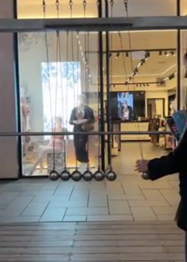 large-scale Newton's cradle made of chrome spheres hanging from the ceiling in front of a store. The cradle is set in motion, and the spheres swing back and forth, transferring momentum. A woman walks in front of the cradle, holding a phone in one hand and a shopping bag in the other. The store behind the cradle has mannequins displayed in the window and merchandise visible inside. The floor is tiled with a light-colored pattern. The lighting is bright and artificial.