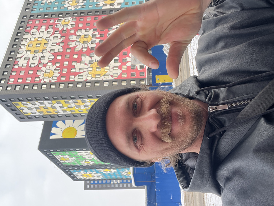 A male individual is depicted in a close-up, waist-up selfie, directly facing the camera with a slight smile. He has fair skin, light-colored eyes with visible crow's feet, a handlebar mustache, and a trimmed beard. His light-colored hair is partially visible beneath a black knit beanie. He wears a black hooded jacket with a front zipper and a black strap across his chest; a small stud earring is present in his left ear. His right hand is raised to shoulder height, forming a gesture with the thumb and index finger joined in a circle, and the remaining three fingers extended upwards. The scene is set outdoors in Murino, Russia, under an overcast sky. In the background are three multi-story residential buildings featuring dark gray facades. The visible sides of these structures are adorned with large-scale murals of white daisies with yellow centers, superimposed on panels of red, yellow, green, and blue. A blue corrugated metal construction fence runs horizontally across the midground, separating the subject from the buildings. Beyond the fence, a yellow utility box or structure is visible to the right. The ground in the foreground and midground is partially covered with snow and slush. A paved area or road with residual snow is also present.