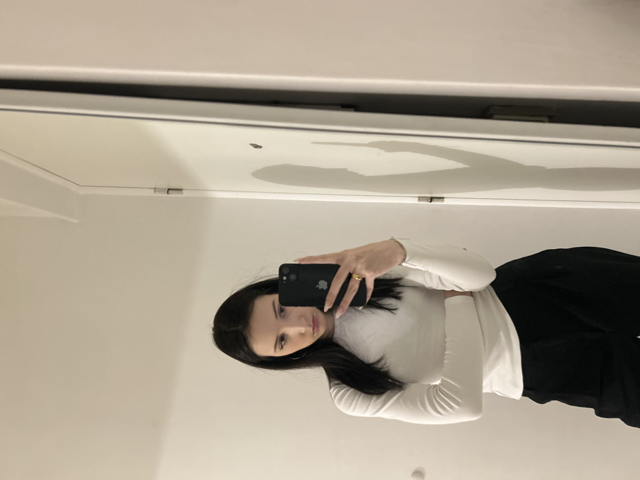 A female individual is depicted in a mirror selfie taken indoors within the city of Cachan, France. She has long, dark, straight hair with a central part and is wearing a white long-sleeved crew-neck top paired with black trousers. A black smartphone, displaying an Apple logo on its rear, is held in her left hand (as visible in the reflection), positioned to capture the image. A gold-colored ring adorns the ring finger of her left hand, and a silver-colored hoop earring is present in her visible left ear. Her fingernails are coated with a light-colored polish. Her right arm (as visible in the reflection) is bent and positioned across her torso. Her gaze is directed downwards toward the phone. The background consists of plain white walls. To the right of the individual's reflection, a white door with a visible hinge is present. Overhead artificial lighting creates a distinct shadow of the individual's form, particularly her right arm and hand (which holds the phone in the real space), cast upon the white door.