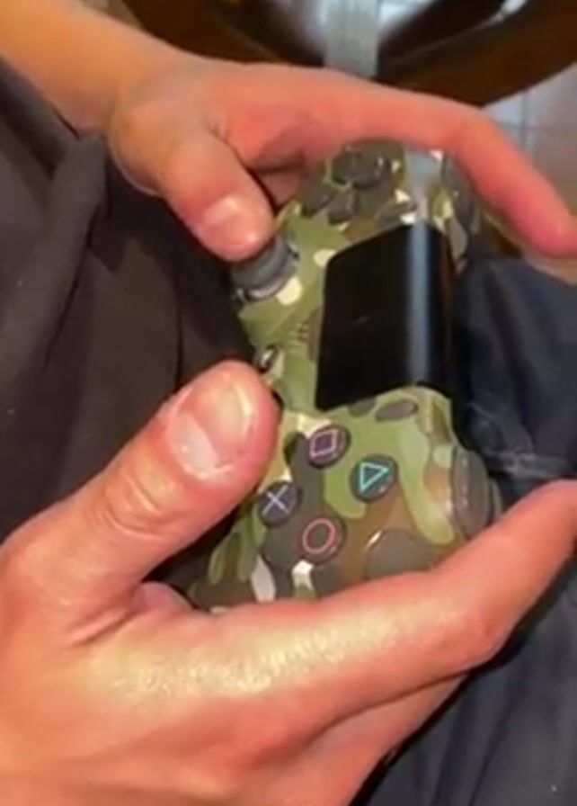 A person holds a camouflage-patterned PlayStation 4 controller in their hands