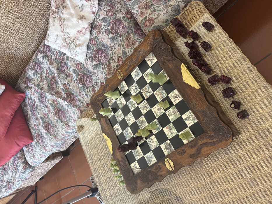 - "This image depicts an indoor scene in Cutrofiano, Italy, focusing on a decorative chess set positioned on a woven rattan coffee table" by FM-UaKXZ2, licensed under CC BY 4.0