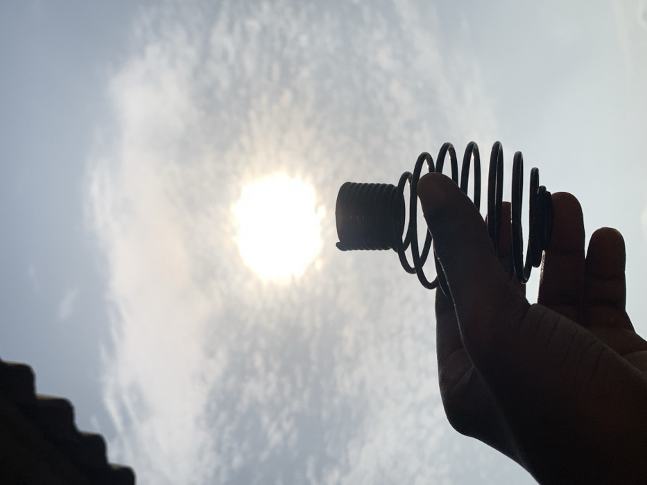 The image displays a low-angle outdoor scene in the city of Ikorodu, Nigeria, under a bright, cloudy sky with the sun visible. A human hand, appearing as a dark silhouette due to intense backlighting, occupies the lower-central portion of the frame. The hand is gripping a black, vertically oriented, coiled metallic object. This object features a tightly wound cylindrical top section, approximately 2-3 cm in height, transitioning into wider, more open helical coils that expand outwards before narrowing towards the base, consistent with a whisk ball or a large industrial spring. The bright sun is prominently featured in the upper-center of the frame, emitting a strong glare. The sky is populated by scattered, thin white clouds against a lighter blue background. In the upper-left corner, a dark, corrugated edge, resembling a roofline or architectural overhang, is partially visible. No other individuals or specific city landmarks are identifiable.