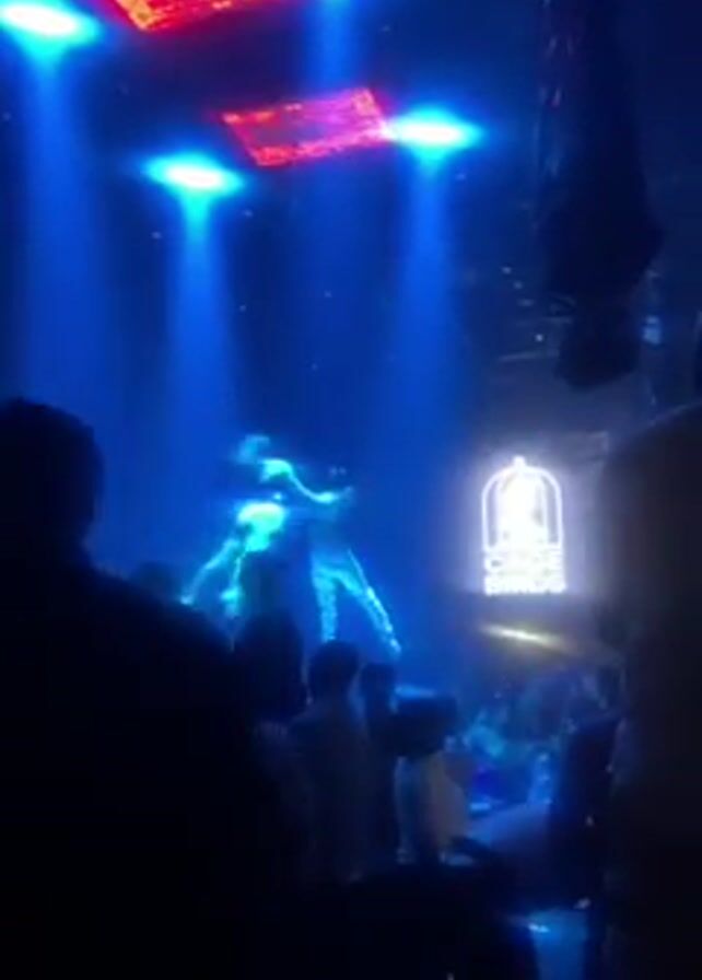 nightclub scene with a performer suspended in the air on silks