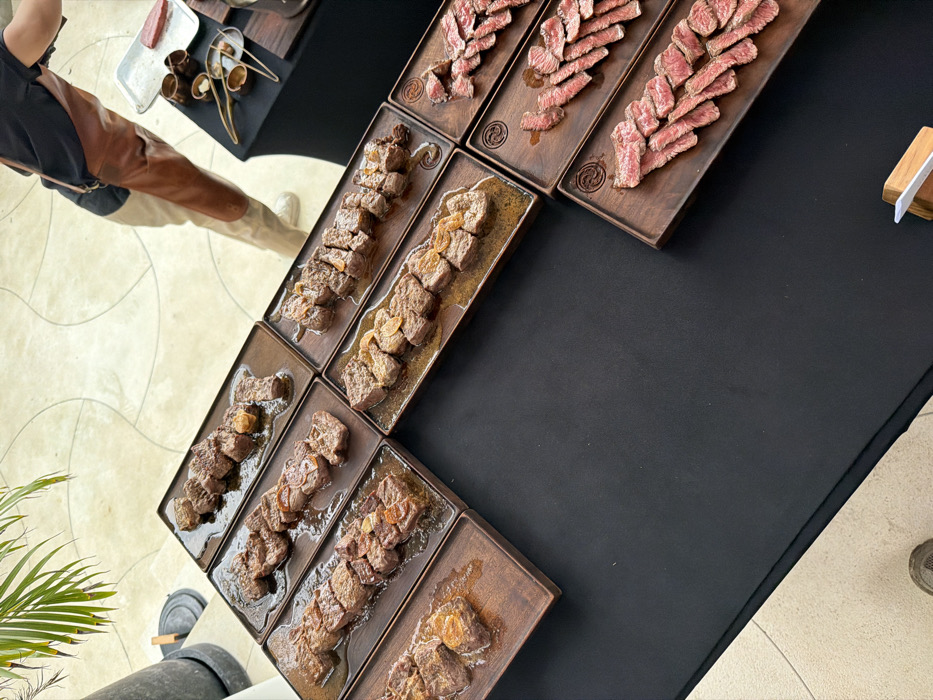 The image displays an overhead view of a food service setup, likely at an event or restaurant in Canggu, Indonesia. A long table, draped with a black tablecloth, dominates the foreground. On this table, nine rectangular wooden platters are arranged. Six of these platters, positioned on the left and middle, contain uniformly cut pieces of cooked meat, possibly beef, resting in a light, glossy sauce and garnished with small, light-colored flakes, likely garlic. The three platters on the right hold thinly sliced, medium-rare cooked meat, arranged without sauce or additional toppings. Several wooden platters feature a stylized spiral carving at one end. In the upper right portion of the image, a person is partially visible, wearing a black t-shirt, light-colored trousers, and white sneakers, with a brown leather apron slung over their shoulder. They are positioned near a smaller auxiliary table, also draped in black fabric. This auxiliary table holds a silver rectangular tray containing a piece of raw red meat, several small wooden bowls, and metal serving utensils. The background consists of light-colored, patterned flooring, and a large dark planter containing green foliage is visible on the far left. The scene is brightly illuminated, indicating an open or well-lit interior or semi-outdoor setting.