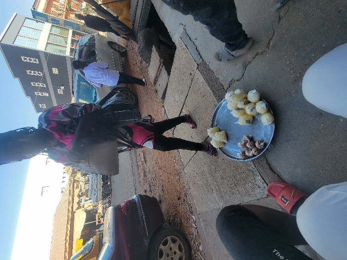 The scene is a street in Maiburiji, Nigeria, under bright daylight. In the immediate foreground, the lower legs and feet of two individuals are visible. One wears white pants and a red slide sandal, while the other wears dark pants and a grey slide sandal. Between them, a silver circular metal tray rests on cracked concrete, displaying wrapped food items: approximately a dozen pale yellow, spherical items individually bagged in clear plastic, and a smaller cluster of about fifteen reddish-brown, possibly nut-based, items also in clear plastic. In the midground, a person walks rightward, slightly obscured, wearing a multi-colored (pink, white, black) patterned top, black pants, and dark sandals, carrying a light-colored shoulder bag. To their left, a maroon sedan is partially visible. To their right, a light-colored SUV is parked, with an individual in a white shirt and dark pants standing near its rear. An open concrete drainage channel runs parallel to the sidewalk on the right. The background reveals an urban setting. On the left, a building with a brown tiled roof is visible, fronted by a market or storage area with numerous stacked white sacks. A truck is partially visible behind these sacks. On the right, a multi-story building features a dark grey facade with multiple rectangular windows and glass sections. Another individual in dark clothing is partially visible behind the SUV on the far right. The sky is clear blue. The ground consists of a dirt road and a concrete sidewalk.