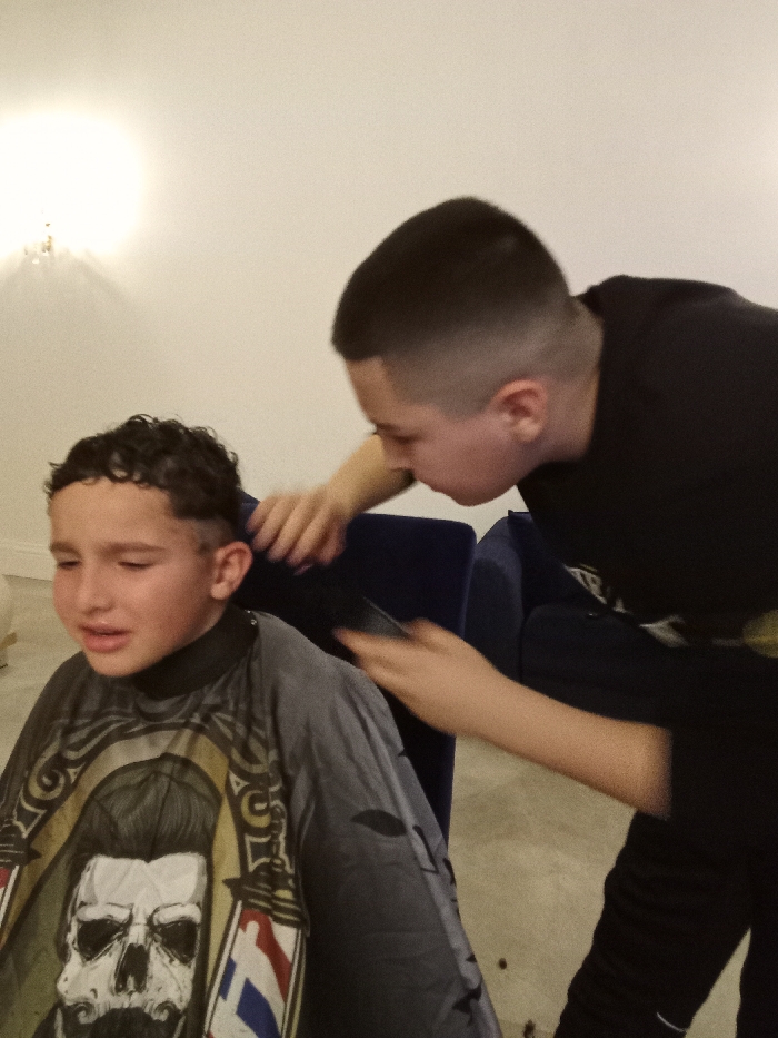An indoor scene in Benkovski, Bulgaria, depicts two young males engaged in a haircut