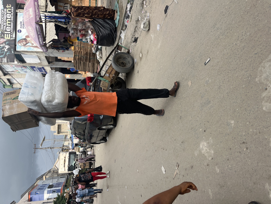 The scene depicts a bustling urban street in Satellite Town, Nigeria, under an overcast sky. The primary subject is a dark-skinned male, estimated mid-20s to 30s, walking forward on a cracked asphalt road. He wears an orange short-sleeved t-shirt with a graphic print, black sweatpants, and dark flip-flops, and carries a stacked load on his head: two large white, shrink-wrapped rectangular bundles supporting two smaller cardboard boxes. His arms are raised, hands placed to stabilize the load. To the subject's immediate right, a two-wheeled handcart, empty except for a small brown box, is parked at the roadside. Adjacent to the cart is a street vendor's setup featuring a purple hexagonal umbrella with "NIVEA" branding. Displayed merchandise includes multiple wigs on mannequin heads, various garments on hangers, and packaged goods in a black plastic bag. Behind this stall, a large stack of flattened cardboard boxes is visible. The background buildings on the right side feature commercial advertisements, one prominently displaying "ELEMENT" and "IMO PLAZA." To the subject's left, a dark-colored minivan or SUV is parked. Beyond it, several pedestrians, including a woman in bright red pants, are walking away from the camera. Further down the street, a white heavy-duty truck is visible. Buildings of varying designs and conditions line both sides of the street, some exhibiting blue and white paint schemes. Overhead utility lines crisscross the frame against the grey sky. The paved road surface is littered with miscellaneous debris, including paper and plastic items. A bare arm and hand are partially visible in the bottom left foreground.