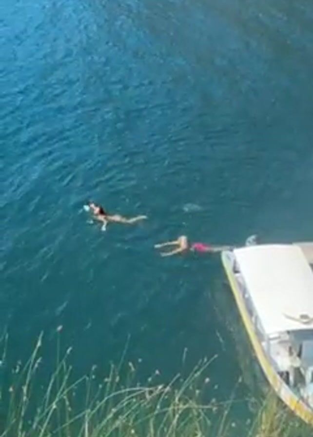 Two women are swimming in a lake. A white boat with a yellow stripe is docked near them. The lake water is a clear turquoise color. In the background, there is a steep hill with trees and small houses on it. The sky is blue.