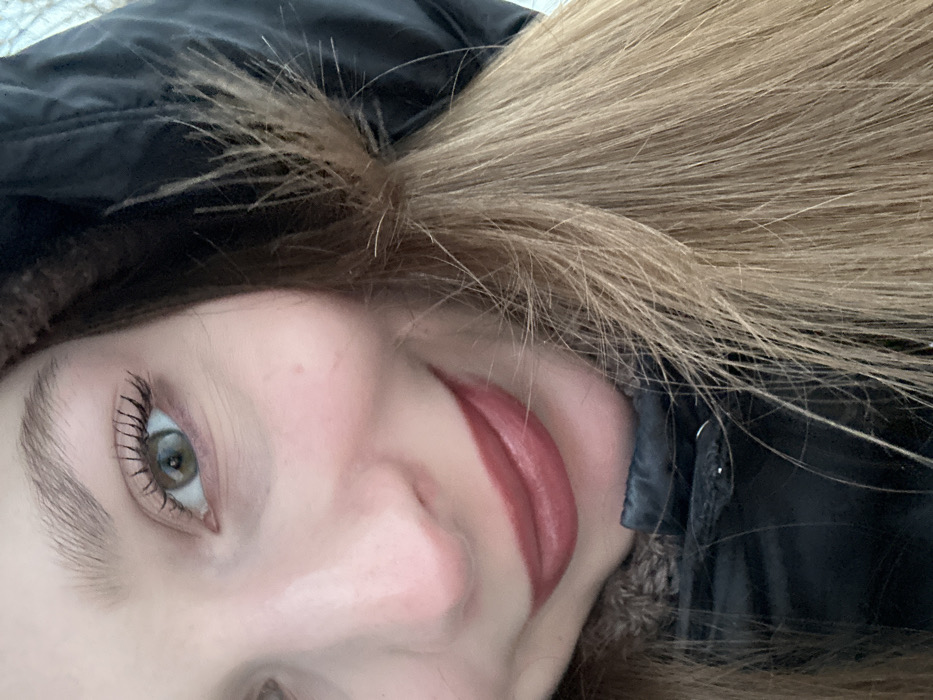 A close-up, angled portrait of a person with fair skin, light brown hair, and green eyes. The person is wearing a black hooded jacket with fur trim. The person is wearing a red-brown lipstick. The image is brightly lit, highlighting the skin and hair texture.