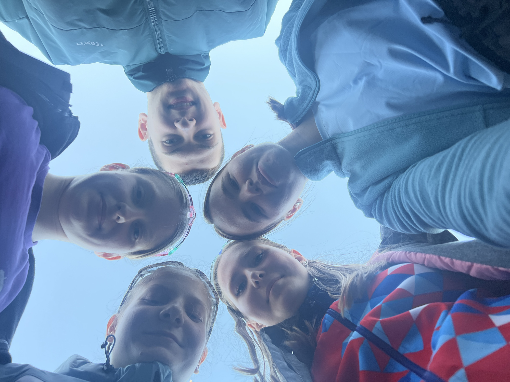 Five people stand in a circle, close together, looking down at the camera. The viewpoint is from directly beneath them, looking up. The individuals appear to be young people, possibly teenagers. One is a male with short dark hair, wearing a dark-colored jacket with the word "TERMITT" visible on the collar. The other four are females. They are wearing an assortment of casual clothing, including jackets, sweatshirts, and t-shirts. One is wearing a colorful headband. The bottommost figure has a red, blue, and white patterned jacket. The background is a light blue, suggesting the sky. The scene appears to be outdoors. There is no evidence in this picture which suggest that this photo was taken in the city of Krylovo, Russia.