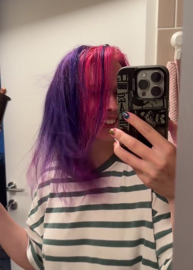 - "A person with purple and pink hair, wearing a green and white striped shirt, is seen in a bathroom mirror taking a selfie video" by FM-NjEox2, licensed under CC BY 4.0