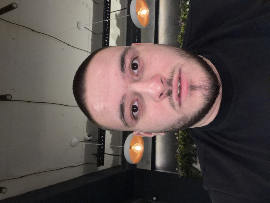 A close-up, front-facing image captures a male individual, appearing to be in his 20s or 30s, with short dark hair, a full dark beard with a goatee, and dark eyes staring directly at the camera