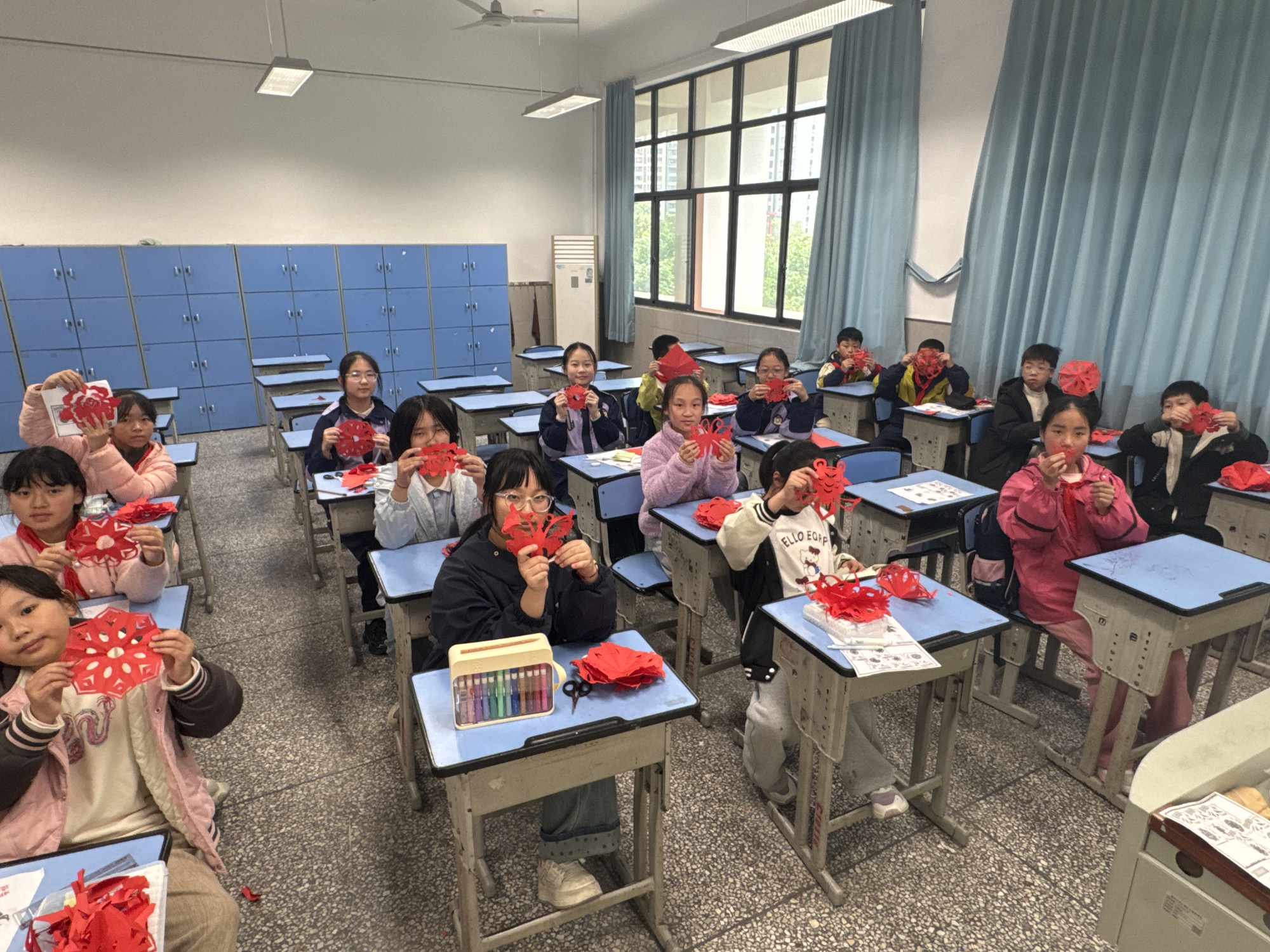 The image depicts a classroom in Longta, China, occupied by approximately 20-25 East Asian students, likely of elementary or middle school age. Students are individually seated at light blue-topped desks with metal frames, arranged in rows facing forward. The classroom features light-colored walls, a speckled grey floor, and a white ceiling equipped with fluorescent lights and a ceiling fan. Along the left wall are blue metal lockers or storage cabinets. A large window on the right side of the room, partially covered by light blue pleated curtains, overlooks multi-story buildings and green trees. All visible students are holding up intricate red paper cutouts, displaying designs ranging from snowflake-like patterns to stylized animals or abstract forms. Many students are looking directly at the camera, with several exhibiting smiles. On some desks, craft supplies such as red paper scraps, scissors, and a multi-compartment container of colored pens or markers are present. The scene captures an active craft session within the educational environment.