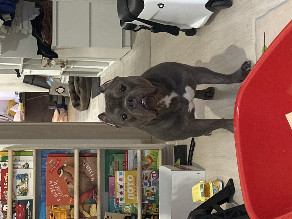 The scene depicts an interior residential space in Murino, Russia. A gray American Bully type dog with cropped ears and a white blaze on its chest stands centrally in the midground, facing directly towards the camera with its mouth slightly ajar. The dog is positioned on a light wood-patterned floor. To the left, a light wooden bookshelf containing numerous children's books, predominantly in Russian, is visible. Prominent titles include "С НОВЫМ ГОДОМ" (Happy New Year) and "ЛОТО ЦВЕТА И ФОРМЫ" (Lotto Colors and Shapes). An open white cardboard box rests on the floor next to the bookshelf. In the bottom left foreground, a red plastic tub partially obstructs the view. Adjacent to it, on the floor, are a yellow toy bus and black toy train tracks. To the right of the dog, a white, multi-tiered storage unit or dresser is present. Further right, a white rolling object with black accents, resembling a piece of luggage or a compact stroller, is partially visible. A doorway or archway in the background leads to an adjacent room, revealing a cluttered floor area with a brown pet bed, a dark mat, and other miscellaneous items. The overall lighting is consistent with indoor artificial illumination.