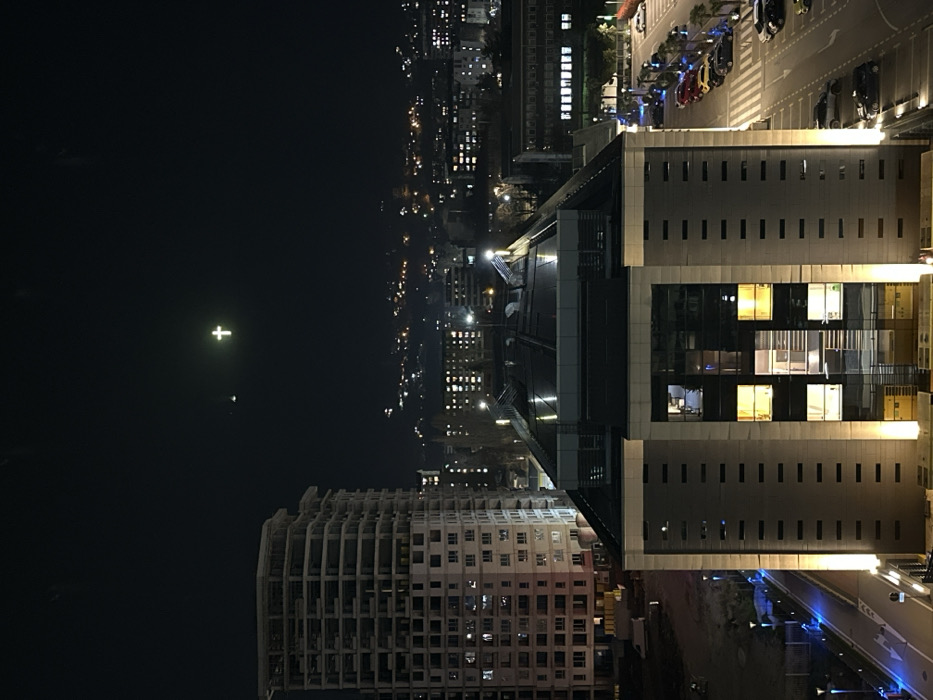 The image presents a nighttime urban scene in Skopje, North Macedonia, viewed from an elevated perspective. Dominating the upper center of the dark sky is the distinctly illuminated Millennium Cross, located atop Vodno Mountain. In the midground, a prominent, multi-story modern building, identified as Capital Plaza, is central to the composition. It features a dark-toned facade with vertical light-colored panels on its sides and a large, central glass section with multiple illuminated interior windows. To the left of Capital Plaza stands a taller, unfinished or under-construction high-rise building, primarily concrete, with numerous exposed floor slabs and window openings. At ground level, a paved area with several parked passenger vehicles (including red, yellow, grey, and black cars) is visible to the right of Capital Plaza, bordering a street with white markings, including a zebra crossing. To the left of Capital Plaza, a pathway or road segment is illuminated by streetlights emitting a blue light. The background features a sprawling cityscape with numerous distant lights from buildings and other urban infrastructure, extending onto hillsides. No people or specific interactions are discernible. The scene captures an urban environment under artificial illumination during nighttime.