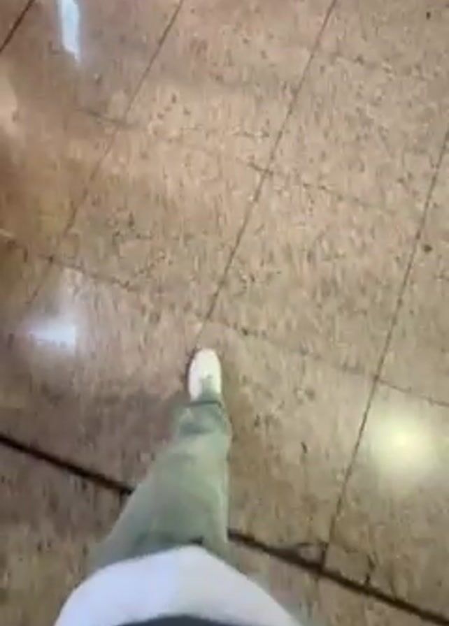 first-person perspective of someone walking on a tile floor. The person is wearing white sneakers and light green pants. The tile floor appears to be inside a building.
