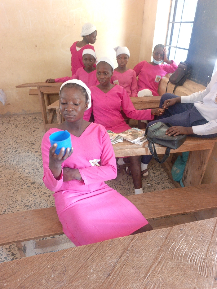This image captures a group of individuals, predominantly young females, seated in what appears to be a classroom in Mada, Nigeria. Seven females are visible, six wearing matching long-sleeved, V-neck pink dresses and white head coverings. One male is partially visible on the right, wearing a white collared shirt and dark trousers. In the foreground, a young female, also in a pink dress and white head covering, sits on a wooden bench, holding a small, light blue plastic cup in her right hand. She is looking down towards the cup. Her left arm is resting across her abdomen. Behind her, five other females are seated at simple wooden desks and benches. One female directly behind her also wears the pink dress and white head covering, looking towards the left. To her right, another female in similar attire looks directly forward. A third female in pink and white head covering is seated further back, looking directly forward. To her right, a fourth female in pink and white head covering, wearing a light blue face mask pulled below her chin, leans back against the wall, resting her right arm on the desk. A fifth female stands in the background on the left, also in a pink dress and white head covering, looking right. On the desk in the middle ground, several books or papers are stacked. A black sling bag rests on the desk next to the female in the face mask. Below the desk, a turquoise bag is visible on the floor. The male on the far right has his hands resting on the desk, one hand appearing to interact with a female's hand. The classroom features light-colored walls, possibly off-white or light yellow, with some faint markings. The floor is covered with patterned, light-colored tiles. A window with dark frames is visible on the right, admitting natural light into the room. The wooden desks and benches appear aged and utilitarian.