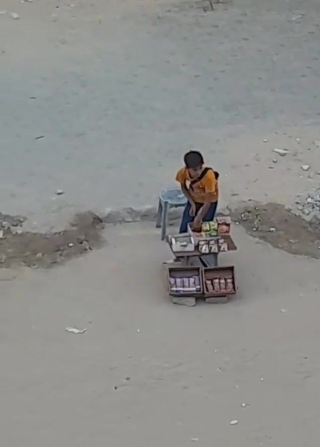 young boy standing behind a small cart of snacks and treats on a flat, dusty surface