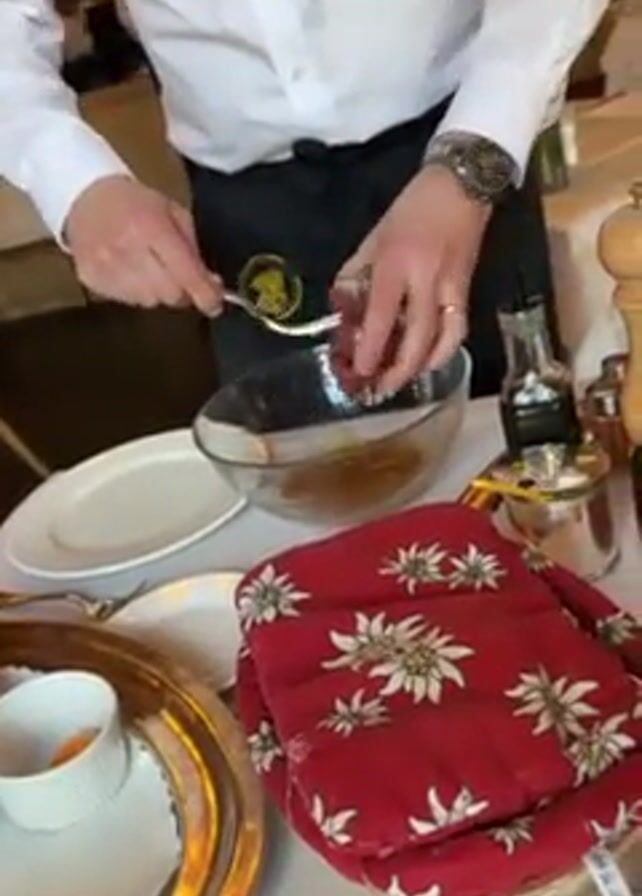 A person dressed as a waiter in a white shirt and black apron is preparing food at a restaurant table