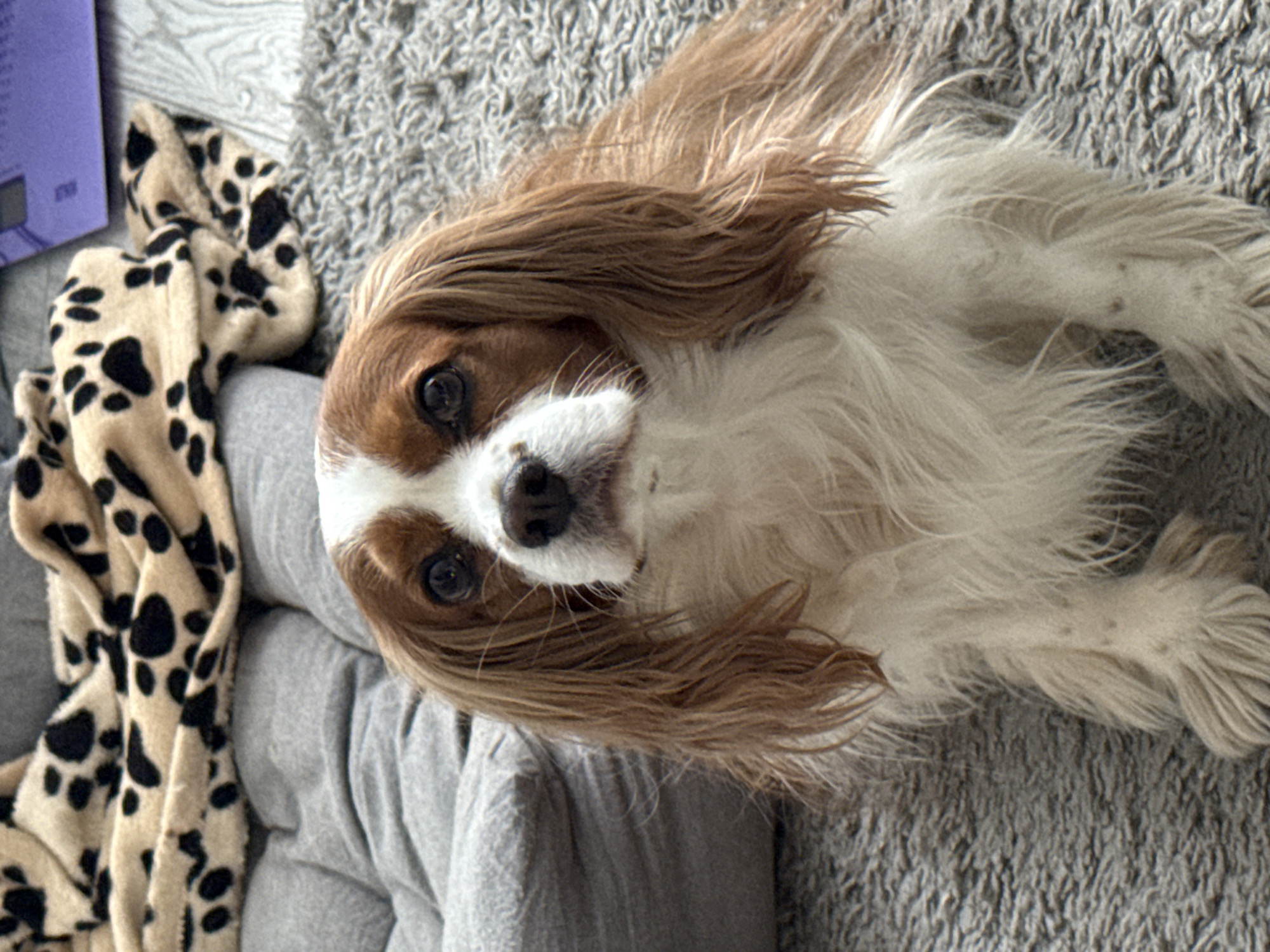 A Cavalier King Charles Spaniel dog with brown and white fur lies on its back, tilting its head towards the camera. The dog is partially supported by a gray cushion or pillow. A beige blanket with black spots is visible to the left of the cushion. The background consists of a gray, shag-style rug. An object, possibly a book or box, is partly visible in the upper left corner. There is no information that can confirm the location of the image is in Sofia, Bulgaria.