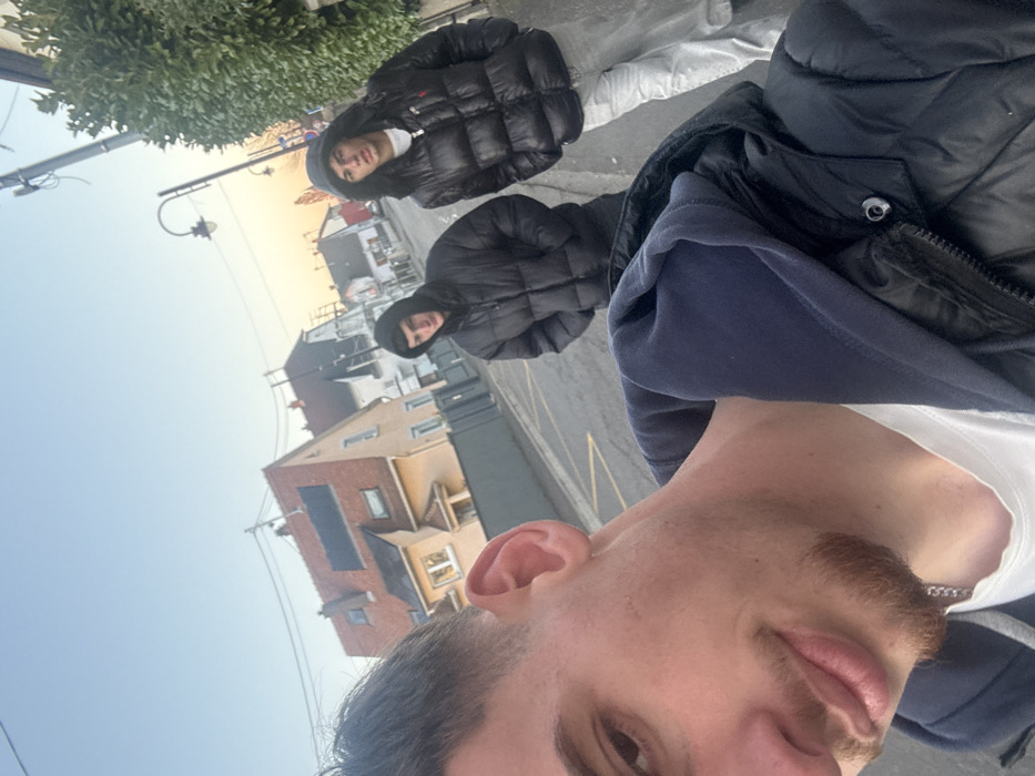 Three young males are depicted on a residential street in Ostwald, France, during what appears to be late afternoon or early evening. The individual in the immediate foreground, partially visible on the left, has short dark hair, a light beard, and wears a white t-shirt, a blue hooded sweatshirt, and a dark puffer jacket, with a silver chain around his neck. He appears to be holding the camera. Behind him, to the left, a second male is visible, wearing a dark hooded puffer jacket with hands in his pockets. To the right, a third male with long dark hair wears a dark hooded puffer jacket and light-colored trousers, with a white pendant visible on his neck. The subjects are standing on an asphalt road featuring faint white ground markings. The background reveals multiple two-story residential houses with pitched roofs (some red-tiled, others darker), characteristic of a suburban streetscape. One prominent house features a light-colored facade with dark panels on its upper section. A dense green hedge runs along the right side of the street, and a black street lamp with a curved arm is visible. Overhead, utility lines crisscross. The sky exhibits a clear blue transitioning to a warm orange-yellow hue towards the horizon. The subjects' attire of puffer jackets indicates cooler weather conditions.
