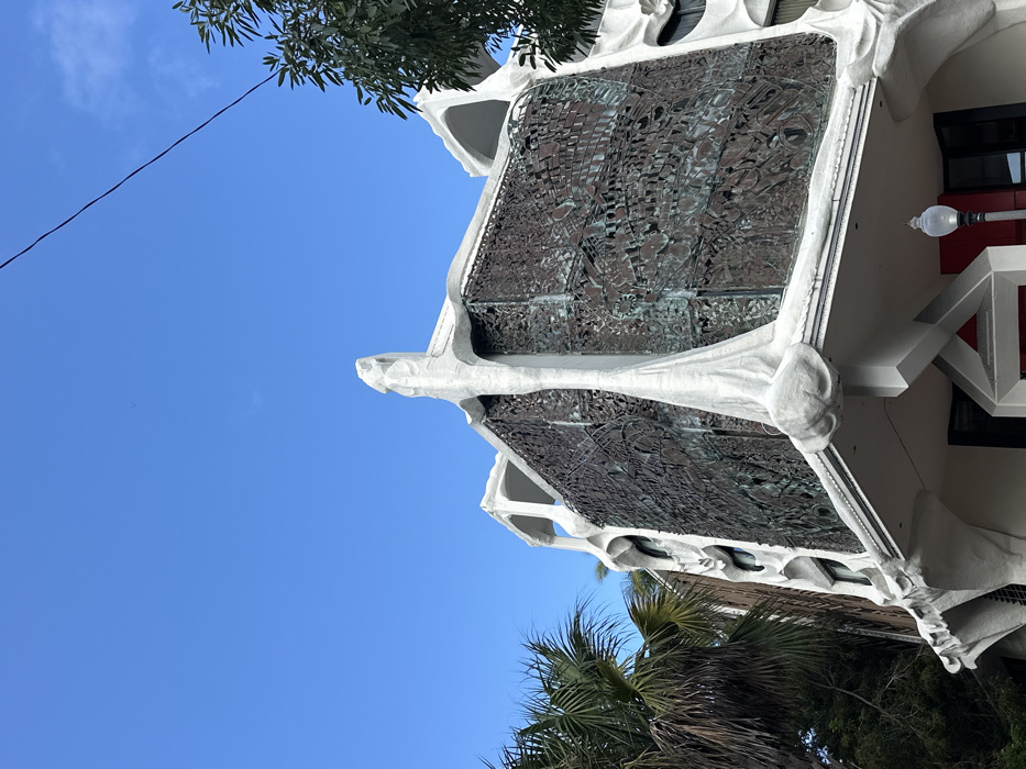 The image depicts a detailed view of the Bacardi Tower, located at 2100 Biscayne Blvd, Miami, Florida, United States, under a clear blue sky. The multi-story building features distinctive white, organically-shaped concrete elements that frame its structure, presenting a sculptural, fluid appearance with rounded contours and tapering vertical accents. The prominent facade is covered by a large, dark, metallic mosaic mural exhibiting intricate, abstract patterns with a visible greenish-brown patina. Windows on the building's visible side are set within irregular white concrete openings. At the lower portion, a white structural overhang is supported by angled concrete beams, with a red element partially visible behind a black street lamp. Palm trees are visible on the left, and green foliage on the right. A single black utility wire traverses the upper right sky. No individuals or active interactions are present in the scene.
