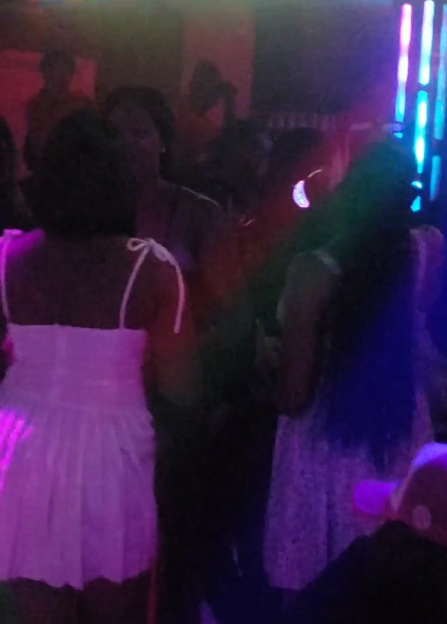 dimly lit nightclub. A sign reads "Lady Eve G". Several people are visible, mostly in silhouette. One person stands out, wearing a short, white dress with spaghetti straps. There are various colorful lights. It appears to be a celebratory atmosphere with people enjoying themselves.