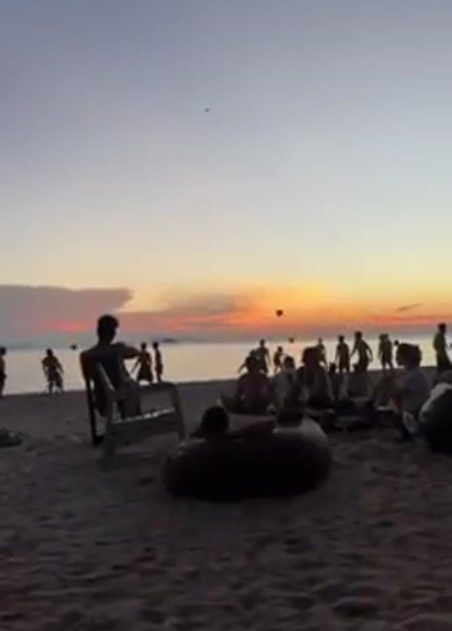 A group of people are silhouetted against a sunset sky on a sandy beach. Some people are playing with a ball in the water near the shore. Others are sitting or lounging on chairs and beanbags on the beach, watching the activities and the sunset. The sunset is colorful with hues of orange, yellow, and pink. A small island is visible on the horizon. The atmosphere appears relaxed and social.