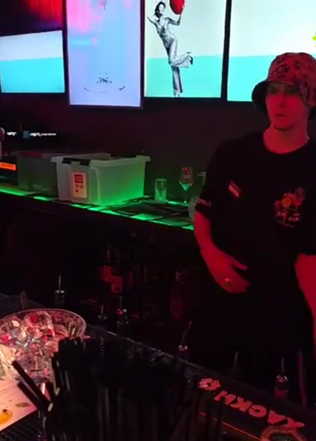 In a nightclub with neon lighting, a young male bartender, wearing a black T-shirt and a red patterned bucket hat, is preparing a cocktail