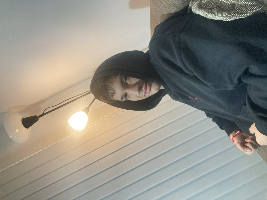 A young male individual is depicted from the chest up in an indoor setting. He is seated and looking directly at the camera with a slight smirk. He wears a black hooded sweatshirt with the hood pulled up, revealing short, dark hair. A red beaded bracelet is visible on his left wrist. To the left of the subject, vertical window blinds are visible. Behind the subject and slightly to the right, a two-headed floor lamp is positioned. The upper lamp head, with a white dome shade, is unlit, while the lower lamp head, featuring a smaller white egg-shaped shade, is illuminated and casting a warm yellow light. A plain, light-colored wall forms the background. The seating surface on the right side of the frame appears to be upholstered in a light brown or beige fabric. The image provides no discernible specific indicators of its location within the city of Sofia, Bulgaria.
