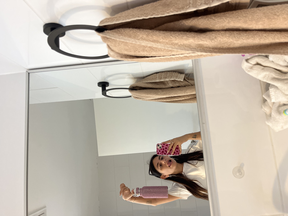 The image depicts a woman taking a mirror selfie in a well-lit bathroom, likely located in a private residence in Ramat Gan, Israel. The woman, with long dark hair, wears a white t-shirt and has sunglasses perched on her head. She holds a pink, rhinestone-studded water bottle with a silver cap aloft in her raised left hand. In her right hand, she holds a smartphone with a pink leopard-print case, pointing it towards the mirror to capture the reflection. She is looking directly into the camera, her tongue extended in a playful manner. A tattoo of three small trees is visible on her left forearm. The bathroom features white rectangular wall tiles, particularly visible behind a black circular towel ring mounted on the wall to the right of the mirror. A light tan towel hangs folded over this ring. The large, unframed mirror occupies the upper-central portion of the frame, reflecting a white ceiling with a rectangular ventilation grate. Below the mirror, a white countertop or sink rim is visible, upon which a folded white towel and a clear suction cup hook are present. The overall environment is clean and modern, predominantly white.